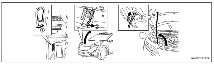 1. Ziehen Sie am Motorhaubenentriegelungsgriff 1 unterhalb der Instrumententafel der Fahrerseite; die Motorhaube springt leicht auf.