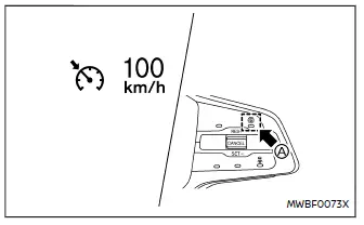 Wenn Sie durch Betätigung des Gaspedals beschleunigen bzw. durch Runterdrücken des Schalters CANCEL in Richtung SET- abbremsen und das Fahrzeug schneller als die vom Fahrer eingestellte Geschwindigkeit fährt, blinkt die Anzeige der eingestellten Fahrzeuggeschwindigkeit.